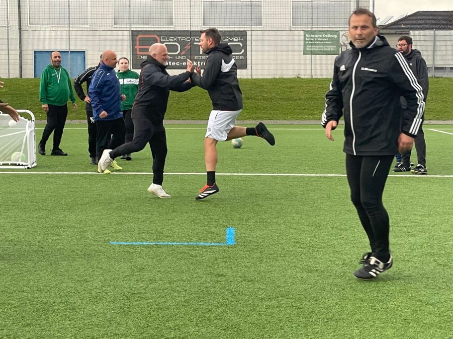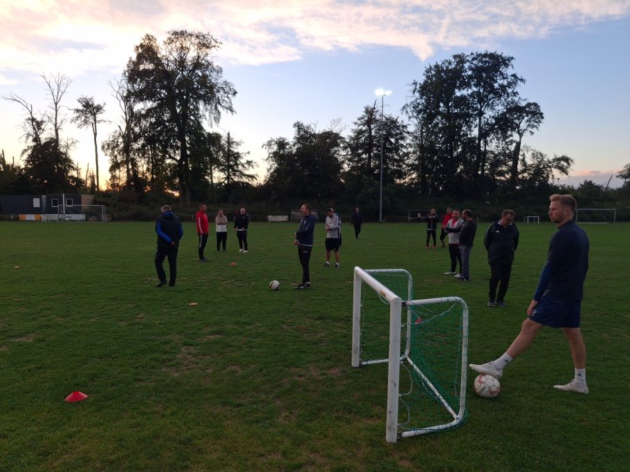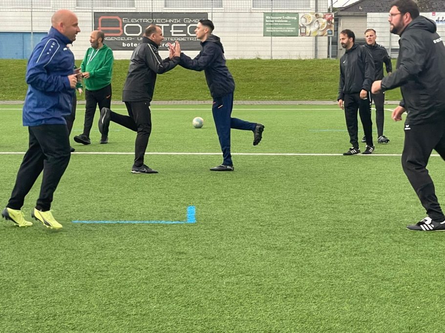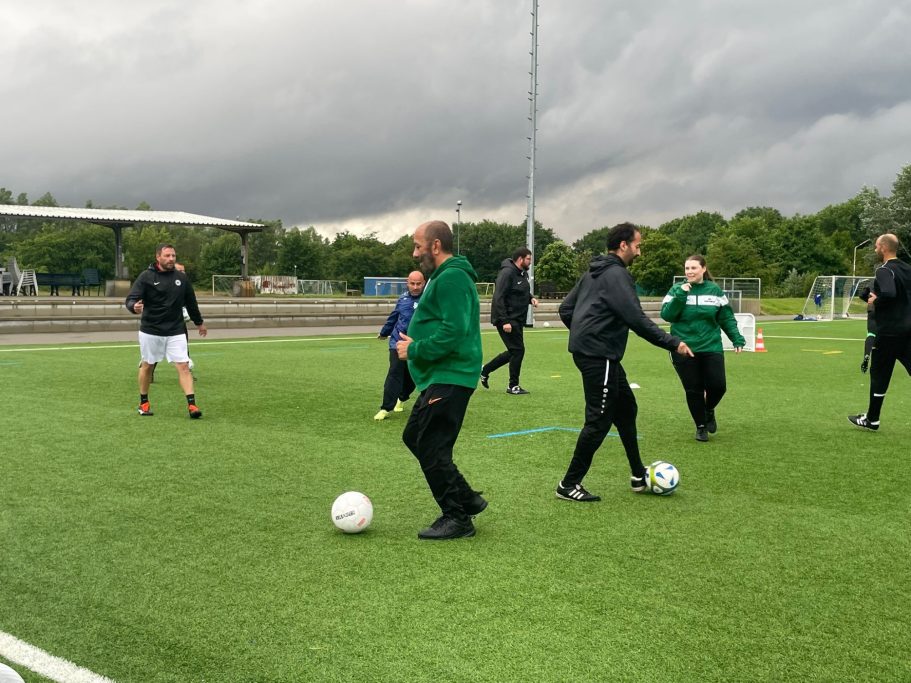 Als es in den praktischen Hauptteil ging, zeigte sich sogar das Wetter als Teamplayer: Der Regen verzog sich und gab den Blick frei auf konzentrierte Gesichter auf dem Kunstrasen. Hier stand nun die Königsdisziplin im Mittelpunkt: die Ballan- und -mitnahme von hohen Bällen insbesondere nach Spielverlagerungen – in dynamischen Spielformen trainierten die Teilnehmenden, jeden Ball sauber zu kontrollieren und das Spiel sofort wieder schnell zu machen.